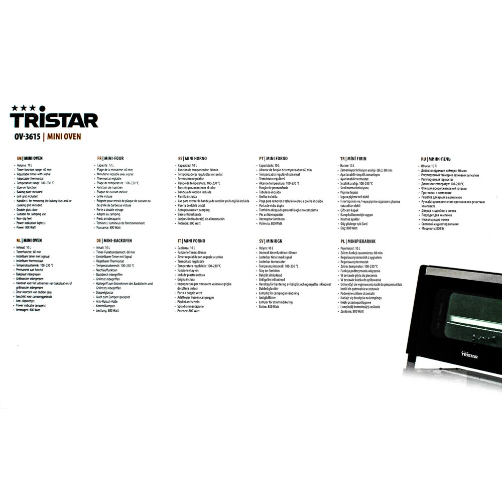 - Lieferumfang: Tristar OV-3615 Miniofen, Backrost, Grillrost, Griff, Bedienungsanleitung